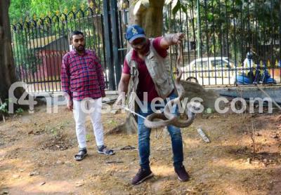Photo Caption : National Civil Defense Member, Mohan rescued a huge Cobra Snake at Cubbon Park, in Bengaluru on Friday 7th April 2023