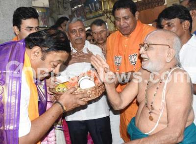 Photo Caption : BJP Basavanagudi MLA candidate Ravi Subramanya offering pooja at a temple before filing the nomination paper for the Assembly Elections at Electoral Office Basavanagudi, in Bengaluru on Monday 17th April 2023