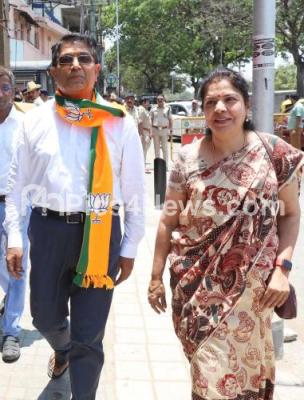 Photo Caption : BJP Chamarajpet MLA candidate Bhaskar Rao arriving to submit his nomination paper for the Assembly Elections at Electoral Office at Good Shed Road, in Bengaluru on Monday 17th April 2023