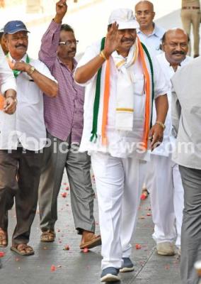 Photo Caption : Congress Chickpet MLA candidate RV Devraj arriving with his supporters to submit his nominations paper for the Assembly Elections at Electoral Office at Chickpet, in Bengaluru on Tuesday 18th April 2023