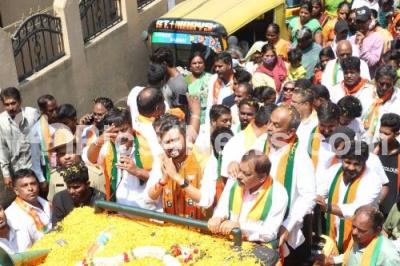 Photo Caption : BJP Gandhi Nagar MLA candidate Sapthagiri Gowda arriving with his supporters to submit his nominations paper for the Assembly elections at Electoral office at Gandhi Nagar, in Bengaluru on Tuesday 18th April 2023