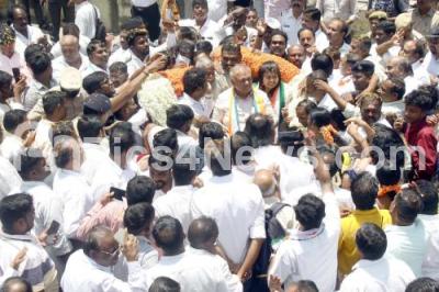 Photo Caption : Congress BTM Layout MLA candidate Ramalinga Reddy arriving with his supporters to submit his nominations paper for the Assembly elections at Electoral office at Koramangala, in Bengaluru on Tuesday 18th April 2023