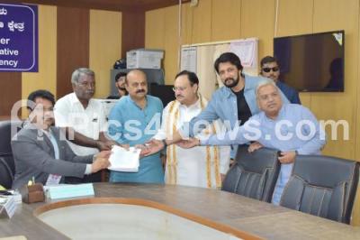 Photo Caption : Chief Minister of Karnataka Basavaraj Bommai submitting his nomination papers to the electoral officer for the Assembly elections, also seen are BJP National President JP Nadda and Actor Sudeep , in Haveri on Wednesday 19th April 2023