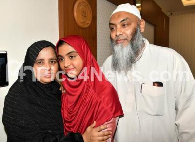 Photo Caption : 2nd PU topper in Arts division Tabassum Sheik of NMKRV college student, celebrating with parents after 2nd PU results were announced today, in Bengaluru on Friday 21st April 2023