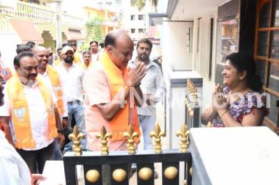 Event Description : Hebbal constituency BJP candidate Katta Jagadish and his supporters during election campaign for the upcoming Karnataka Assembly polls, in Bengaluru on Wednesday 26th April 2023