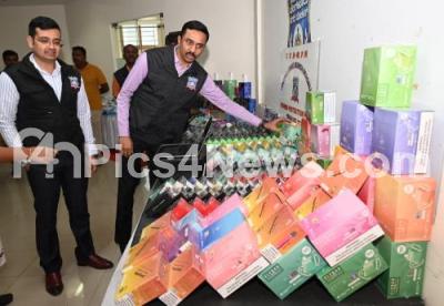 Photo Caption : CCB officials inspects the seized E Cigarettes and liquids during a property parade, in Bengaluru on Wednesday 3rd May 2023