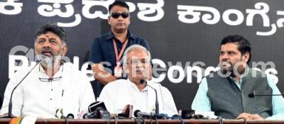 Photo Caption : Chhattisgarh Chief Minister Bhupesh Baghel and KPCC President, DK Shivakumar, during a press conference at KPCC office, in Bengaluru on Sunday 7th May 2023
