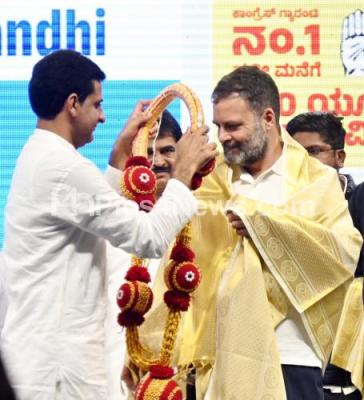 Photo Caption : Congress leader Rahul Gandhi being felicitated by Shivaji Nagar candidate Rizwan Arshad during public meeting at Shivajinagar, as part of the Karnataka Assembly Elections campaign, in Bengaluru on Sunday 7th May 2023