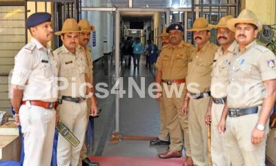 Photo Caption : Tight security being deployed at the strong room at KR Circle, where Karnataka Assembly Election EVM machines are stored in strong rooms, in Bengaluru on Thursday 11th May 2023