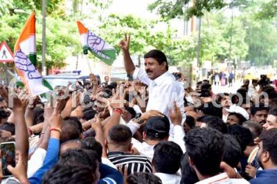 Photo Caption : Congress winning candidate Byrathi Suresh celebrates the victory in the Karnataka Assembly Election, in Bengaluru on Saturday 13th May 2023