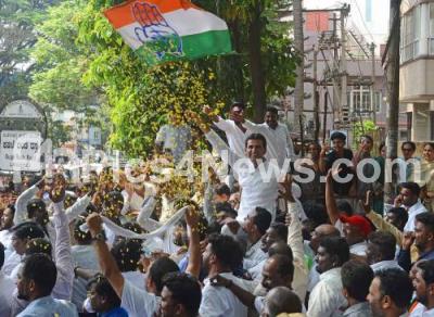 Photo Caption : Congress winning candidate Rizwan Arshad celebrates the victory in the Karnataka Assembly Election, in Bengaluru on Saturday 13th May 2023