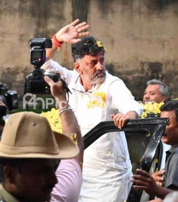 Photo Caption : Congress leader DK Shivakumar gets a grand welcome after arriving at HAL airport, in Bengaluru on Thursday 18th May 2023