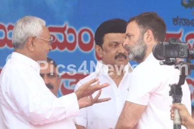 Photo Caption : Congress leaders Rahul Gandhi with Bihar CM Nitish Kumar and Tamil Nadu CM MK Stalin during oath taking ceremony of Karnataka chief Minister and Deputy Chief Minister at Sree Kanteerava Stadium, in Bengaluru on Saturday 20th May 2023