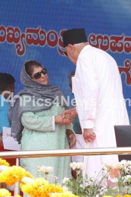 Photo Caption : Former Chief Ministers of Jammu and Kashmir Farooq Abdullah and Mehbooba Mufti during oath-taking ceremony of Karnataka chief Minister and Deputy Chief Minister at Sree Kanteerava Stadium, in Bengaluru on Saturday 20th May 2023