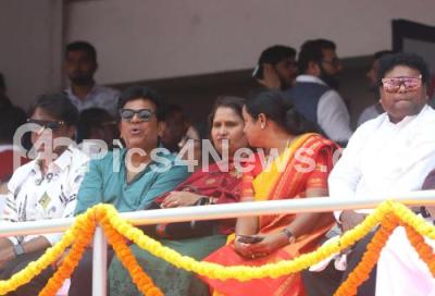 Photo Caption : Film Actors Shivarajkumar with his wife Geetha Shivarajkumar, Duniya Vijay, Sadu Kokila and Umashree during oath-taking ceremony of Karnataka chief Minister and Deputy Chief Minister at Sree Kanteerava Stadium, in Bengaluru on Saturday 20th May 2023