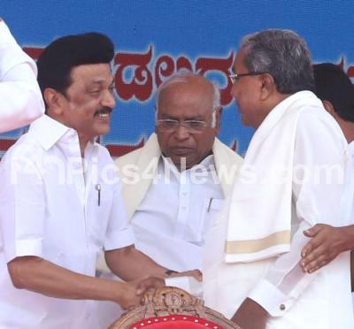 Photo Caption : AICC President Mallikarjuna Kharge with Karnataka Chief Minister Siddaramaiah and Tamil Nadu CM MK Stalin during oath-taking ceremony of Karnataka chief Minister and Deputy Chief Minister at Sree Kanteerava Stadium, in Bengaluru on Saturday 20th May 2023