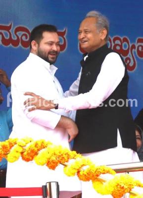 Photo Caption : Bihar DCM Tejashwi Prasad Yadav and Ashok Gehlot Chief Minister of Rajasthan during oath-taking ceremony of Karnataka chief Minister and Deputy Chief Minister at Sree Kanteerava Stadium, in Bengaluru on Saturday 20th May 2023