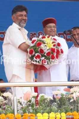 Deputy Chief Minister of Karnataka DK Shivakumar being greeted by Karnataka Governor Thaawar Chand Gehlot during oath-taking ceremony of Karnataka chief Minister and Deputy Chief Minister at Sree Kanteerava Stadium, in Bengaluru on Saturday 20th May 2023
