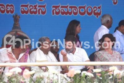 Photo Caption : Congress leaders Priyanka Gandhi, Rahul Gandhi with CM Siddaramaiaha, DCM DK Shivakumar during oath-taking ceremony of Karnataka chief Minister and Deputy Chief Minister at Sree Kanteerava Stadium, in Bengaluru on Saturday 20th May 2023