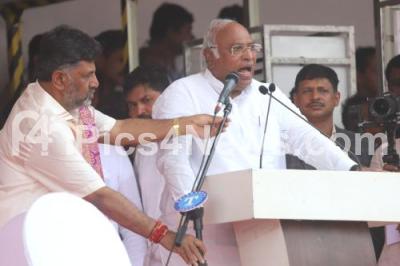 Photo Caption : AICC President Mallikarjuna Kharge and DCM of Karnataka DK Shivakumar during oath-taking ceremony of Karnataka chief Minister and Deputy Chief Minister at Sree Kanteerava Stadium, in Bengaluru on Saturday 20th May 2023