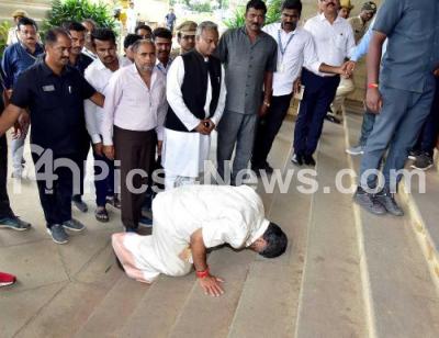 Photo Caption : DCM DK Shivakumar arriving at Vidhana Soudha after taking oath, in Bengaluru on Saturday 20th May 2023