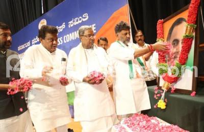 Chief Minister Siddaramaiah with DCM DK Shivakumar paid floral tribute to Former PM Rajiv Gandhi during the death anniversary programme at the party office, in Bengaluru on Sunday 21st May 2023