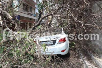 Photo Caption : A tree uprooted on a car at Shiva Nagar, West of Chord Road due to yesterday heavy downpour, in Bengaluru on Monday 22nd May 2023