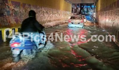 Photo Caption : Nehru circle railway underpass flooded due to heavy rainfall in the city , in Bengaluru on Tuesday 23rd May 2023
