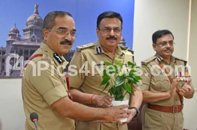 Photo Caption : IG and DG Alok Mohan being welcomed by Police Commissioner Pratap Reddy and MA Saleem, Additional Director General of Police and Special Commissioner of Police Traffic at Police Commissioner Office, in Bengaluru on Thursday 25th May 2023