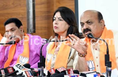 Photo Caption : Meenakshi Lekhi, Union Minister of State for External Affairs and Culture with BJP State President Nalin Kumar Kateel, Former CM Basavaraj Bommai and BJP leaders during a press conference at BJP office, in Bengaluru on Monday 29th May 2023