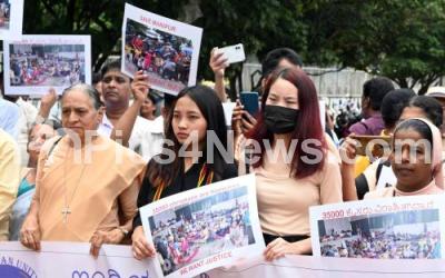Photo Caption : Members of Indian Christian Unity Forum hold placards during a protest against alleged atrocities on Christians in Manipur, in Bengaluru on Tuesday 30th May 2023