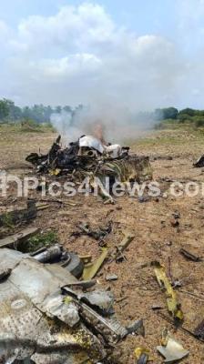 Photo Caption : An Indian Air Force (IAF) trainer aircraft Kiran crashed at Bhogapura about 10 km from Chamarajanagar town, the pilots identified by the local police as Tejpal and Bhumika, who sustained injuries, were airlifted to Bengaluru for treatment, in Chamarajanagar on Thursday 1st June 2023