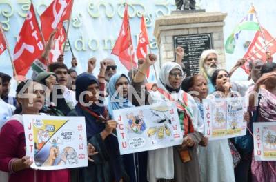 Photo Caption : Members of JCTU staged a protest to express solidarity with wrestlers protest against WFI President Brij Bhushan Singh at Freedom Park, in Bengaluru on Thursday 1st June 2023