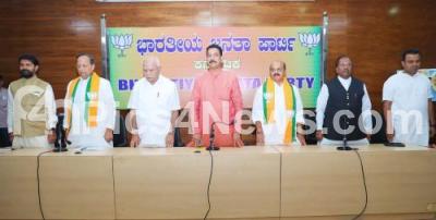 Photo Caption : BJP Karnataka incharge Arun Singh, Former CMs BS Yediyurappa, Basavaraj Bommai, DV Sadananda Gowda, BJP State President Nalin Kumar Kateel during the BJP MLAs meeting at Party office , in Bengaluru on Thursday 8th June 2023