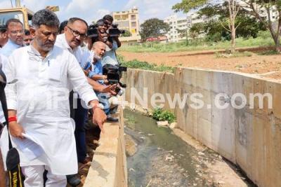 Photo Caption : DCM DK Shivakumar with BBMP officials inspecting the status of the Raju Kaluve, waste barrier of lakes and drainage in various parts of Bengaluru, in Bengaluru on Thursday 8th June 2023