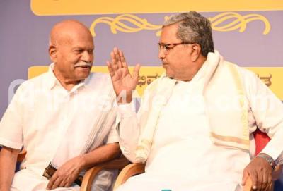 Photo Caption : Chief Minister Siddaramaiah with Nadoja Hampa Nagarajaiah seen discussing during 20th anniversary of Karnataka Kannada Writers and Publishers Association and Award presentation program at Gandhi Bhavan, in Bengaluru on Saturday 24th June 2023