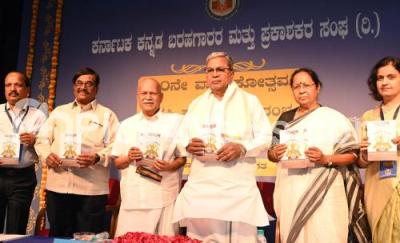 Photo Caption : Chief Minister Siddaramaiah with Nadoja Hampa Nagarajaiah and others releasing souvenir during 20th anniversary of Karnataka Kannada Writers and Publishers Association and Award presentation program at Gandhi Bhavan, in Bengaluru on Saturday 24th June 2023