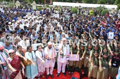 Photo Caption : DCM of Karnataka DK Shivakumar with Karnataka Sports Minister B Nagendra and students during the International Day against Drug Abuse and Illicit Trafficking at Vidhana Soudha, in Bengaluru on Monday 26th June 2023