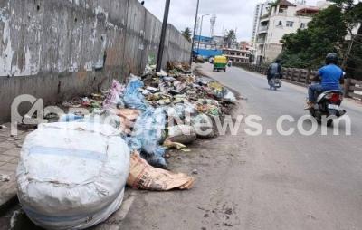 Garbage not cleared and causing inconvenience to pedestrians and motorists at Netaji Road, Shivajinagar, in Bengaluru on Monday 26th June 2023