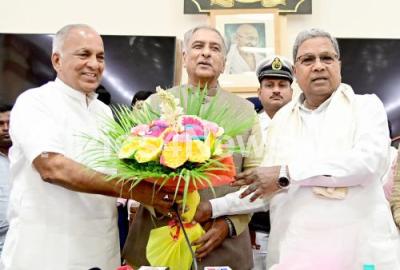 Photo Caption : Karnataka Legislative Council Chairman Basavaraj Horatti and Chief Minister of Karnataka Siddaramaiah greet Newly elected Karnataka Legislative Council member NS Boseraju during oath taking ceremony at vidhana Soudha, in Bengaluru on Monday 3rd July 2023