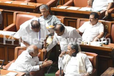 Photo Caption : Chief Minister of Karnataka Siddaramaiah discussing with Ministers during Assembly Session at Vidhana Soudha, in Bengaluru on Monday 10th July 2023