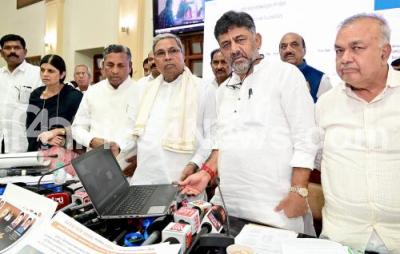 Photo Caption : CM Siddaramaiah with DCM DK Shivakumar, Minister KH Muniyappa and others launched payment of cash in lieu of the additional 5 kilograms of rice to beneficiaries under the governments “Anna Bhagya” scheme at Vidhana Soudha, in Bengaluru on Monday 10th July 2023
