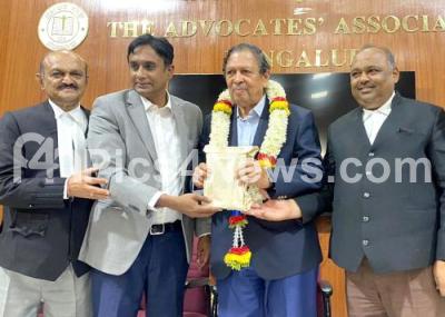 Photo Caption : Former Lokayukta Justice N Santosh Hegde being felicitated by The Advocates Association, Bengaluru, also seen are Vivek Subba Reddy, President, AAB, TG Ravi, General Secretary and others during Decline in Moral Values and the Constitution at High Court, in Bengaluru on Tuesday 11th July 2023