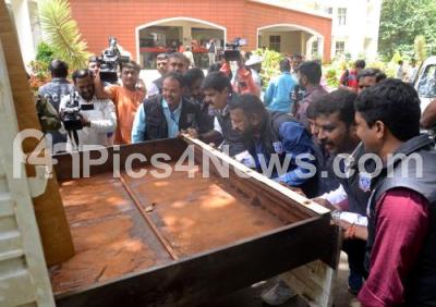 Photo Caption : CCB personnel displaying the secret box and number plate of the vehicle which was used to smuggle ganja. Bangalore City CCB Women Protection Squad seized around 1500 Kgs of Ganja worth rupees 12 crores and arrested three persons during a press conference at the Police Commissioner office, in Bengaluru on Saturday 15th July 2023