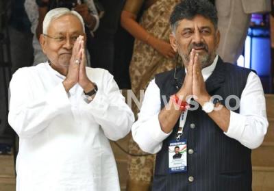 Photo Caption : Bihar CM Nitish Kumar and other party leaders during United opposition parties meeting at a private hotel, in Bengaluru on Tuesday 18th July 2023