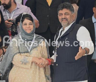 Photo Caption : Former Chief Ministers of Jammu and Kashmir Mehbooba Mufti and DCM of Karnataka DK Shivakumar during United opposition parties meeting at a private hotel, in Bengaluru on Tuesday 18th July 2023