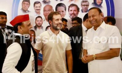 Photo Caption : Akhilesh Yadav President of Samajwadi Party and Congress leader Rahul Gandhi and other party leaders during United opposition parties meeting at a private hotel, in Bengaluru on Tuesday 18th July 2023 Pics
