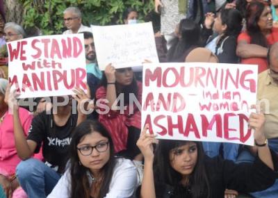 Photo Caption : Activists from various organizations protest and demand constitutional promise of safety and dignity for all women on the recent issue of violence in Manipur, the protest was held at Town Hall, in Bengaluru on Friday 21st July 2023