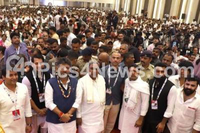 Photo Caption : Chief Minister of Karnataka Siddaramaiah with DCM of Karnataka DK Shivakumar, National Youth Congress President Srinivas BV and Youth congress members during National Youth Convention at Palace Grounds, in Bengaluru on Wednesday 26th July 2023