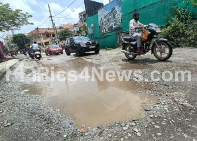 Photo Caption : Pothole roads at Horamavu Agara main road and has been causing major inconvenience to people and motorists, in Bengaluru on Sunday 13th August 2023